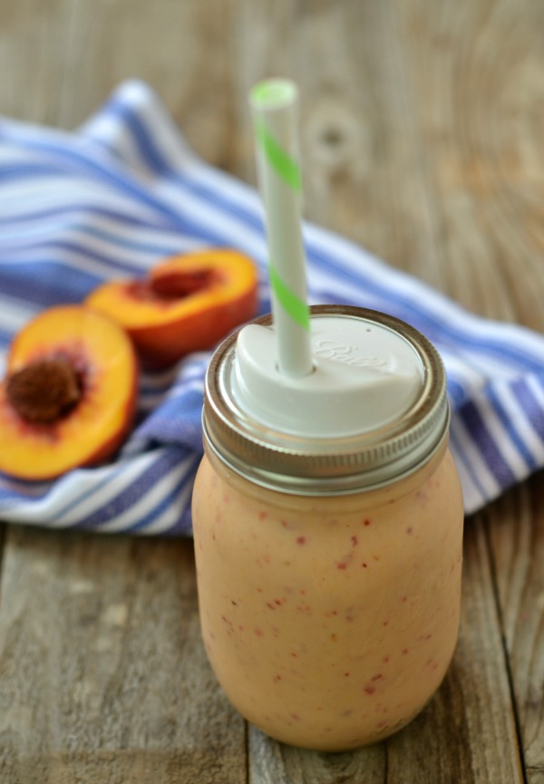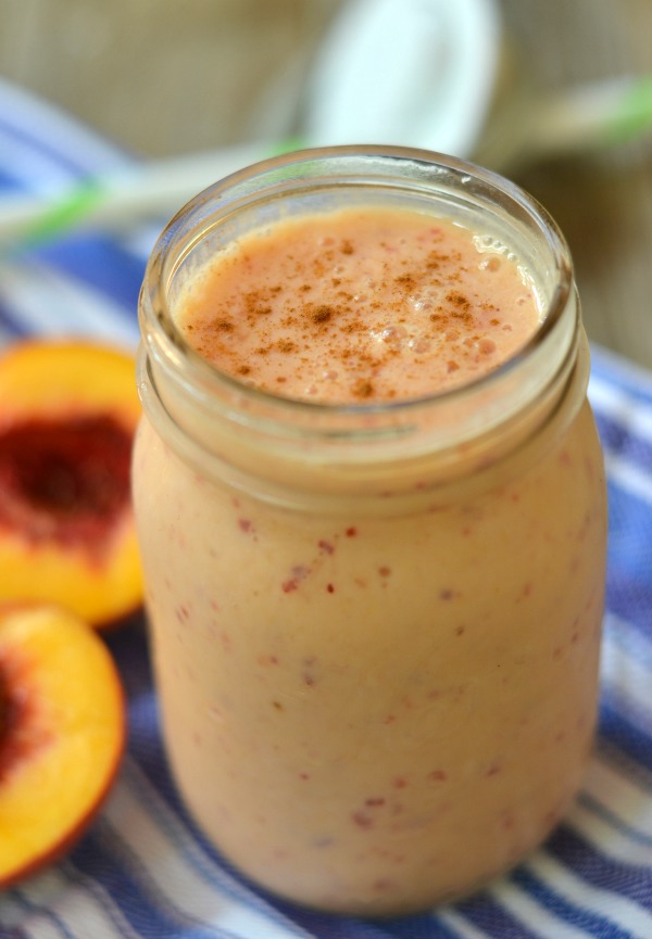 Like dessert in a jar! This Peach Cobbler Smoothie takes advantage of the awesome fresh peaches right now and gives you a solid excuse to have dessert for breakfast!