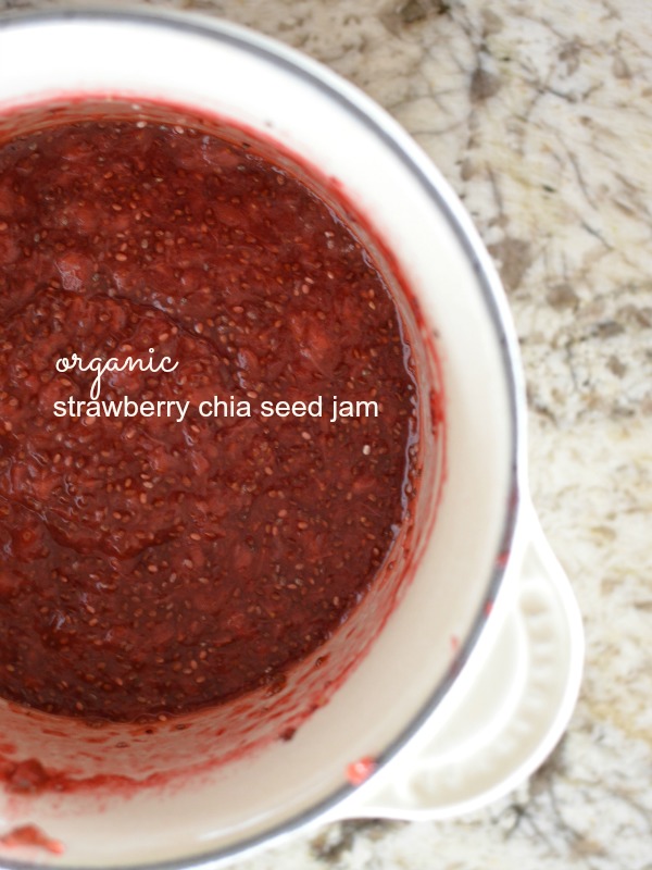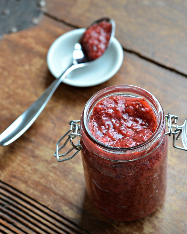 This quick and healthier version of freezer jam has only 2 tablespoons of maple syrup and is thickened with heart healthy chia seeds.